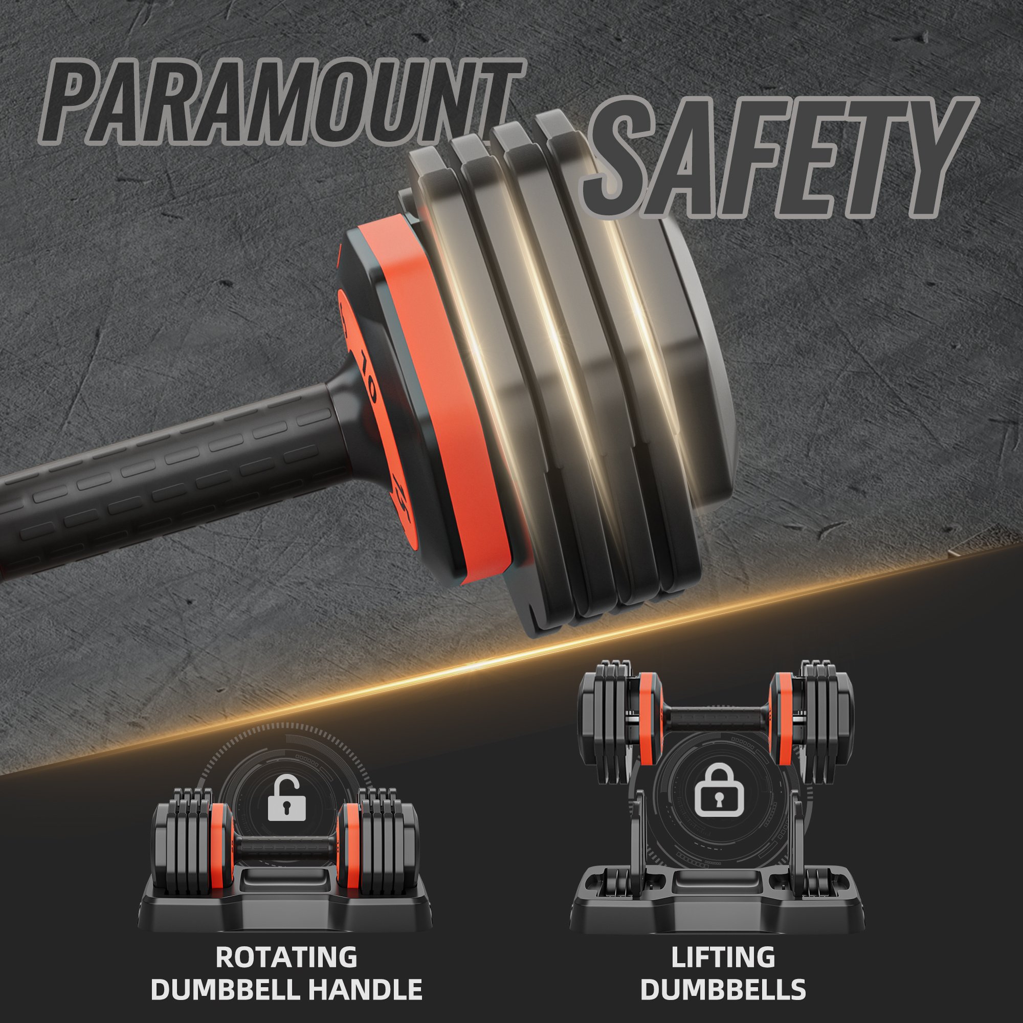 [New Safety Structure Design]: Double safety buckles on the tray and handle bar, so that the adjustable dumbbells can only be adjusted on the tray, ensuring the safety and stability of the dumbbell pieces during exercise after leaving the tray.
