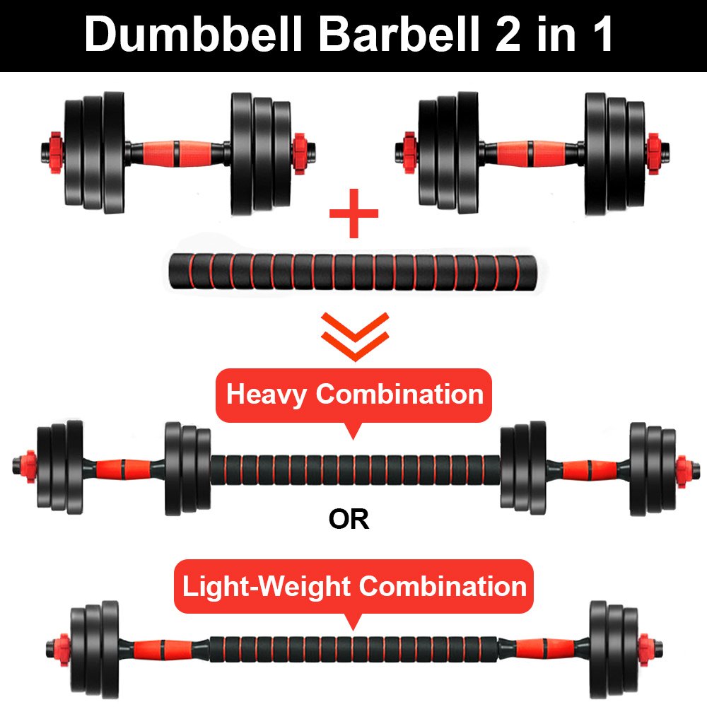2 in 1 Multifunctional Dumbbell Set: The dumbbell set can be adjusted into barbell set easily with the central connector.Free combination is more convenient: the weight can be freely adjusted to suit the use of various forces.New environmentally friendly PVC material: wear-resistant and non-slip, better protection of the floor, 40cm thick foam connector, safe decompression plus non-slip, sweat-proof and comfortable handle, for pleasant exercise anytime, anywhereFor Sport Lovers: The barbell weight set is ideal fitness equipment for everyone who loves sports.It helps train your muscle, quads, glutes, abs, biceps.Simple assemble, small size, the best choice for home fitnessPackage Includes:1 x 40cm connector, 2 x 40cm dumbbell bar, 4x nuts, 1.25KG x 4 + 1.5KG x 4 + 2KG x 4 plates
