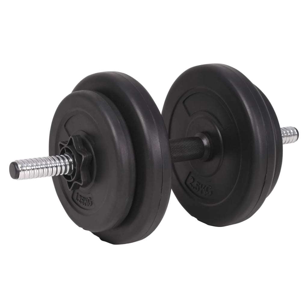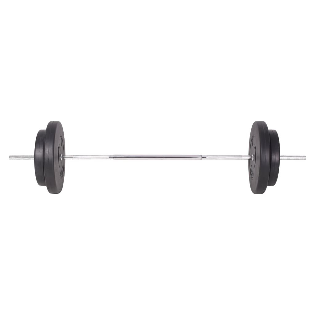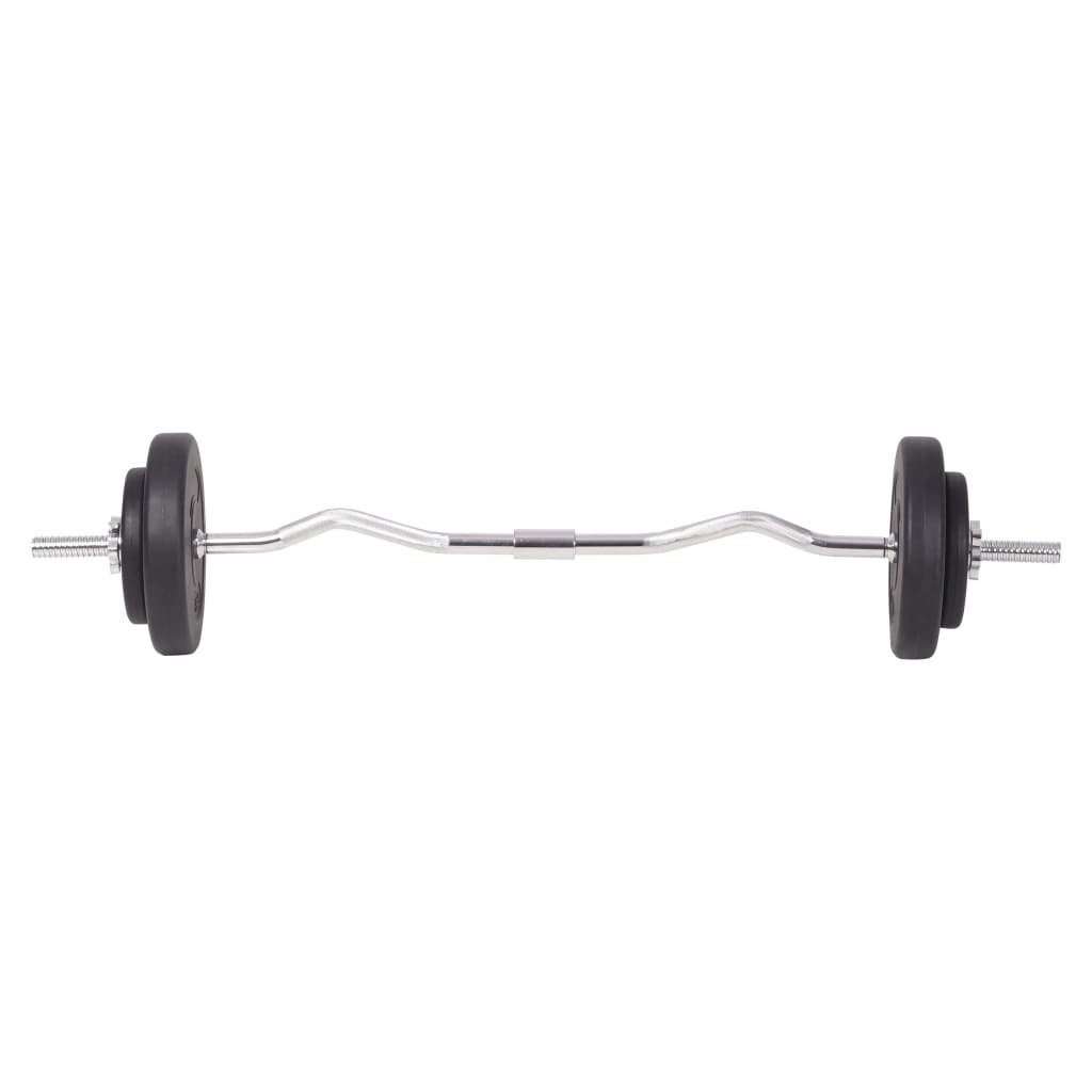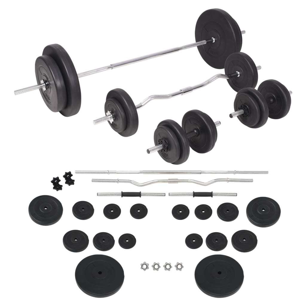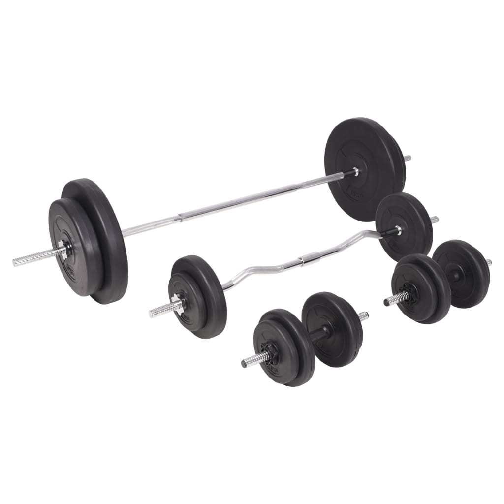 This set allows the users to variably select the weights they want to lift for different exercises. These plates are made of cement with a plastic shell and they can easily be secured onto the bars with the included star locks. The weight is clearly stamped on each plate for quick and easy identification.Color: BlackMaterial: Cement plates + steel barsDiameter of plates (33.1 lb): 15.7"Diameter of plates (22 lb): 12.4"Diameter of plates (11 lb): 9.8"Diameter of plates (4.4 lb): 8.5"Diameter of plates (2.8 lb): 7.1"Hole diameter: 1"Barbell bar (straight) dimensions: 1" x 65" (Diameter x L)Barbell bar (super curl) dimensions: 1" x 47.2" (Diameter x L)Dumbbell bar dimensions: 1" x 17.7" (Diameter x L)Total weight: 198.4 lbBarbell bar (straight) weight: 14.4 lbBarbell bar (super curl) weight: 11.9 lbDumbbell bar weight (each): 1.3 lbPlate weight: 2 x 33.1 lb + 2 x 22 lb + 2 x 11 lb + 4 x 4.4 lb + 6 x 2.8 lbDelivery includes:2 x Plate (33.1 lb)2 x Plate (22 lb)2 x Plate (11 lb)4 x Plate (4.4 lb)6 x Plate (2.8 lb)1 x Barbell bar (straight)1 x Barbell bar (super curl)2 x Dumbbell bar4 x Metal star lock (for barbell)4 x Plastic star lock (for dumbbell)With accessories