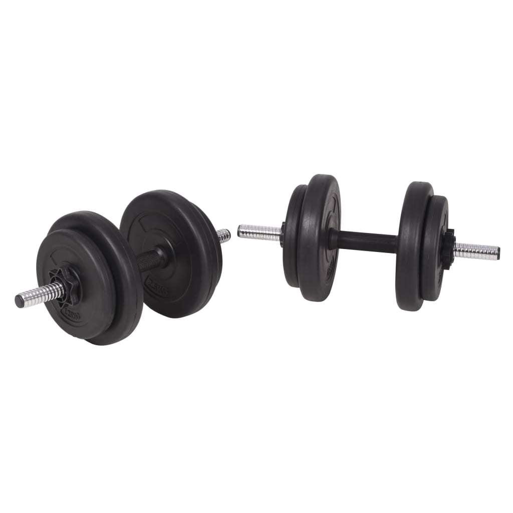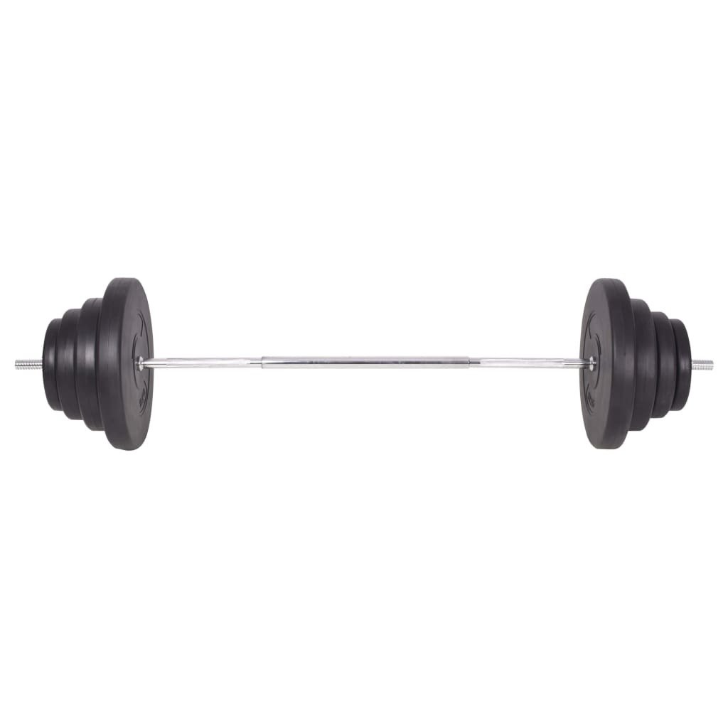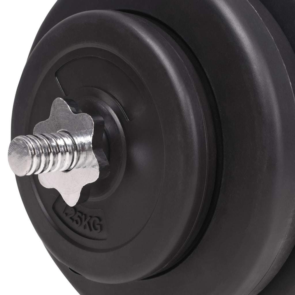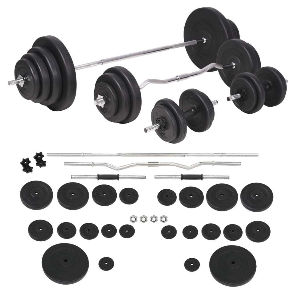 This set allows the users to variably select the weights they want to lift for different exercises. These plates are made of cement with a plastic shell and they can easily be secured onto the bars with the included star locks. The weight is clearly stamped on each plate for quick and easy identification.Color: BlackMaterial: Cement plates + steel barsDiameter of plates (33.1 lb): 15.7"Diameter of plates (22 lb): 12.4"Diameter of plates (16.5 lb): 11.8"Diameter of plates (11 lb): 9.8"Diameter of plates (4.4 lb): 8.5"Diameter of plates (2.8 lb): 7.1"Hole diameter: 1"Barbell bar (straight) dimensions: 1" x 65" (Diameter x L)Barbell bar (super curl) dimensions: 1" x 47.2" (Diameter x L)Dumbbell bar dimensions: 1" x 17.7" (Diameter x L)Total weight: 264.6 lbBarbell bar (straight) weight: 14.4 lbBarbell bar (super curl) weight: 11.9 lbDumbbell bar weight (each): 1.3 lbPlate weight: 2 x 33.1 lb + 2 x 22 lb + 2 x 16.5 lb + 4 x 11 lb + 6 x 4.4 lb + 6 x 2.8 lbDelivery includes:2 x Plate (33.1 lb)2 x Plate (22 lb)2 x Plate (16.5 lb)4 x Plate (11 lb)6 x Plate (4.4 lb)6 x Plate (2.8 lb)1 x Barbell bar (straight)1 x Barbell bar (super curl)2 x Dumbbell bar4 x Metal star lock (for barbell)4 x Plastic star lock (for dumbbell)With accessories