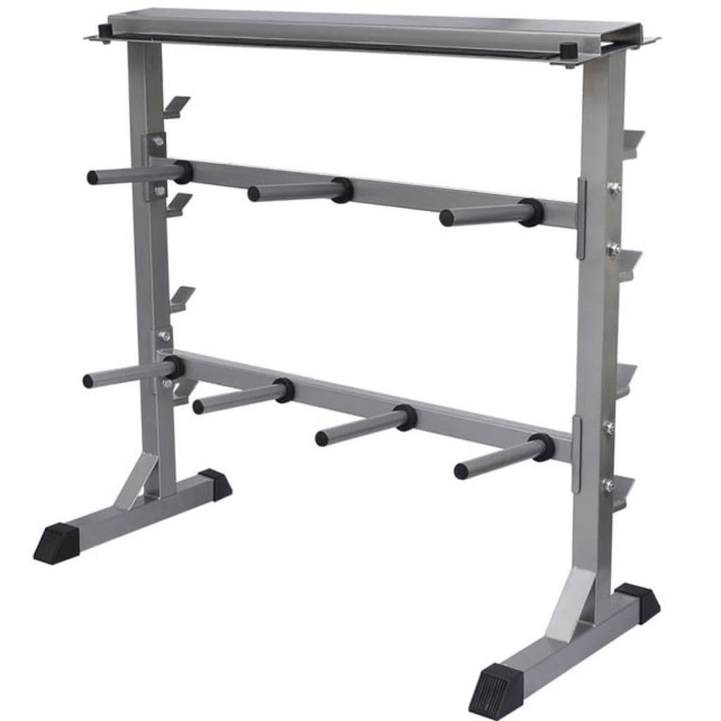 This dumbbell barbell rack is designed to keep free weights, dumbbells and barbells organized and off the floor. It accommodates most dumbbell sizes and styles, including neoprene and cast iron. The stable frame and two shelves will help you maintain a cleaner home gym environment by providing a spot to park your dumbbells when they are not in use.