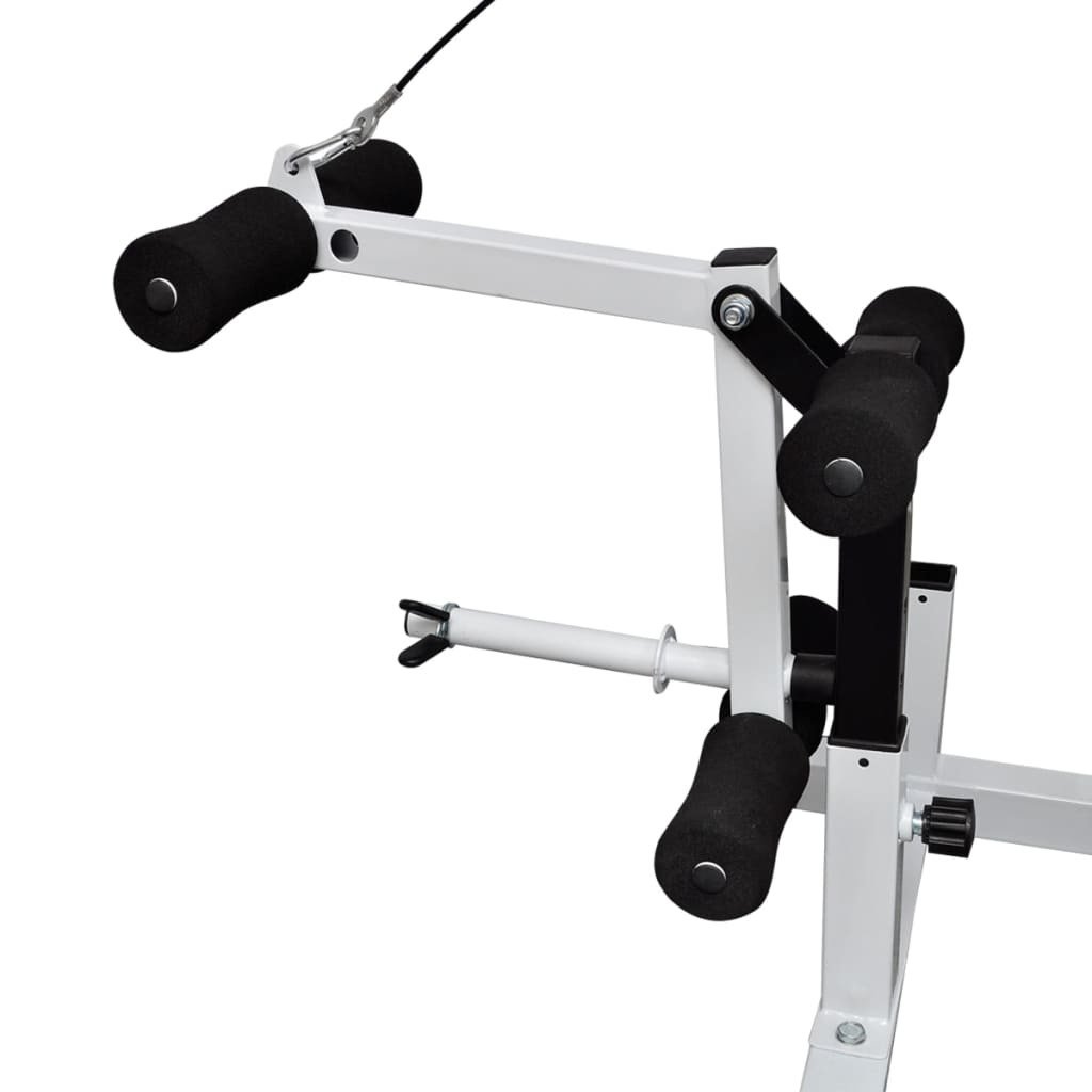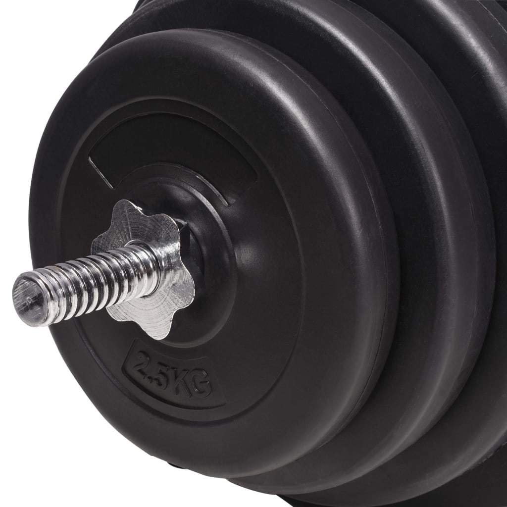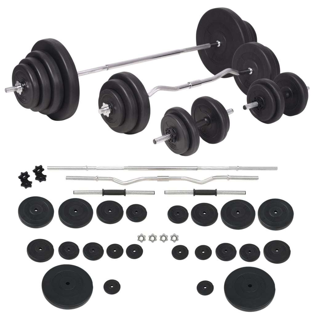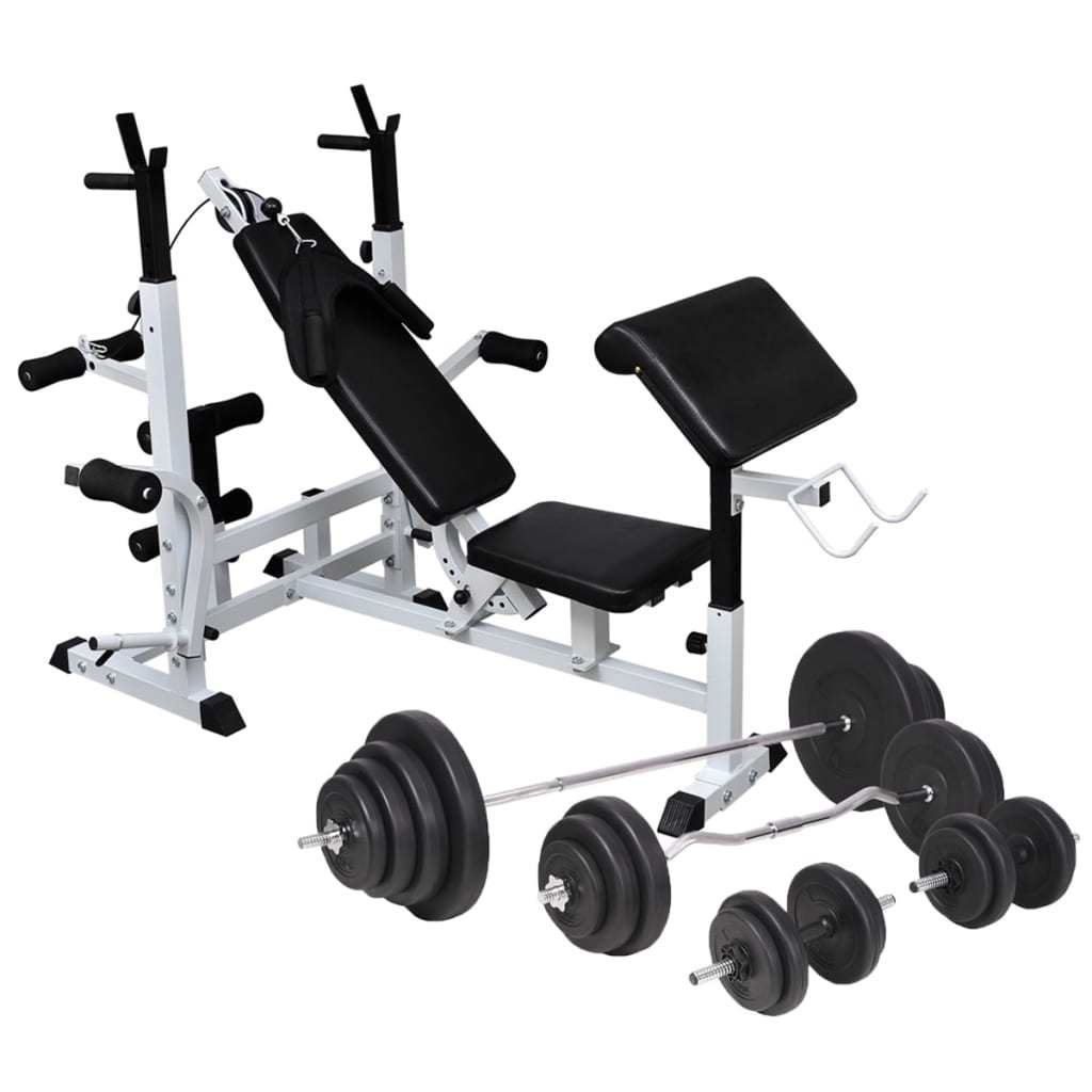 This set allows the users to variably select the weights they want to lift for different exercises. These plates are made of cement with a plastic shell and they can easily be secured onto the bars with the included star locks. The weight is clearly stamped on each plate for quick and easy identification.Weight bench:Color: White and blackMaterial: SteelDimensions: 70.9" x 49.6" x (40.6" - 48.4") (L x W x H)Cushion size: 18.9" x 11.8" (L x W)Backrest dimensions: 26.8" x 9.4" x 1.6" (L x W x T)Backrest height adjustable in 7 settings: Minimum 16.5", maximum 42.9"Arm curl cushion dimensions: 17.3" x 11" x 1.6" (L x W x T)Arm curl cushion adjustable in 4 settings: Minimum 30.3", maximum 36.2" Bar support height adjustable in 5 settings: Minimum 40.6", maximum 48.4" Main tube size: 2" x 2" (L x W)Tube diameter for weight plates: 1"Maximum bar support weight: 176.4 lb Maximum leg extension weight: 77.2 lbMaximum butterfly arm weight: 66.1 lbBarbell and dumbbell set:Color: BlackMaterial: Cement plates + steel barsDiameter of plates (33.1 lb): 15.7"Diameter of plates (22 lb): 12.4"Diameter of plates (16.5 lb): 11.8"Diameter of plates (11 lb): 9.8"Diameter of plates (5.5 lb): 8.5"Diameter of plates (2.8 lb): 7.1"Hole diameter: 1"Barbell bar (straight) dimensions: 1" x 65" (Diameter x L)Barbell bar (super curl) dimensions: 1" x 47.2" (Diameter x L)Dumbbell bar dimensions: 1" x 17.7" (Diameter x L)Total weight: 264.6 lbBarbell bar (straight) weight: 14.1 lbBarbell bar (super curl) weight: 11.9 lbDumbbell bar weight (each): 1.3 lbPlate weight: 2 x 33.1 lb + 2 x 22 lb + 2 x 16.5 lb + 4 x 11 lb + 6 x 5.5 lb + 6 x 2.8 lbDelivery includes:1 x Weight bench2 x Plate (33.1 lb)2 x Plate (22 lb)2 x Plate (16.5 lb)4 x Plate (11 lb)6 x Plate (5.5 lb)6 x Plate (2.8 lb)1 x Barbell bar (straight)1 x Barbell bar (super curl)2 x Dumbbell bar4 x Metal star lock (for barbell)4 x Plastic star lock (for dumbbell)With accessories