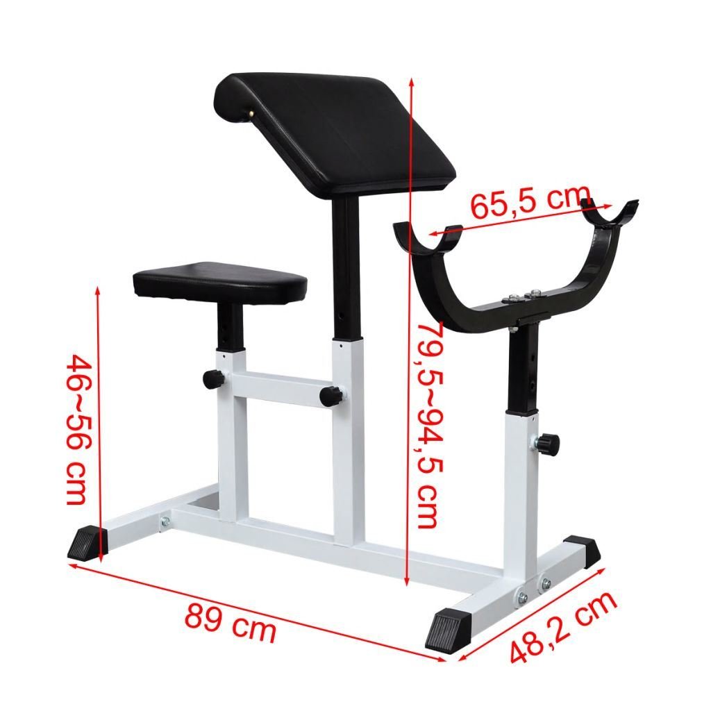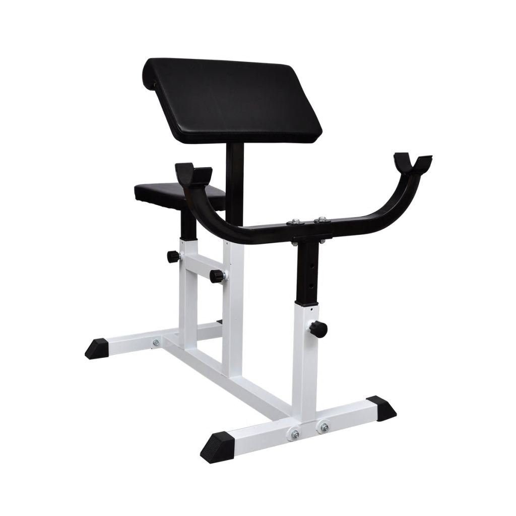 The seat, arm curl cushion and bar support are set with 4 or 5 adjustable knobs, and the height adjust in seconds to ensure that you have a safe and satisfying workout