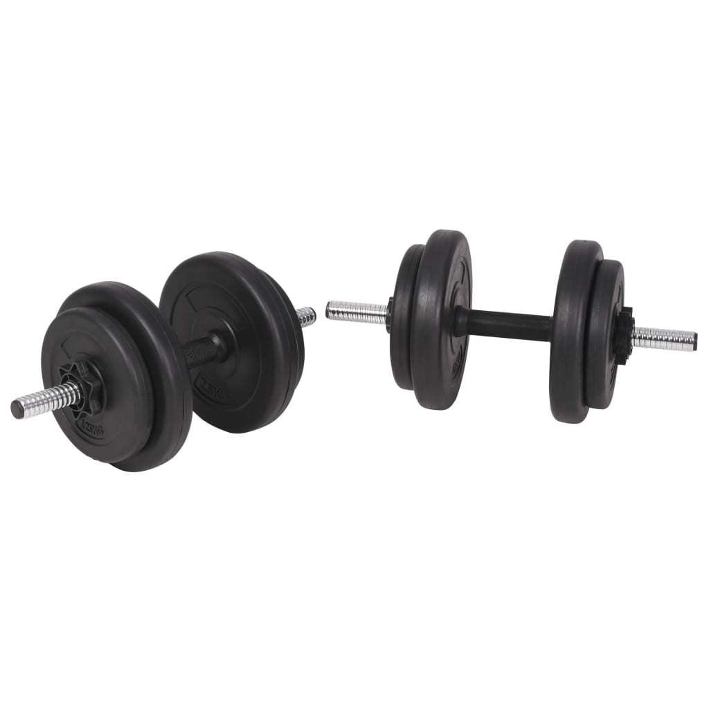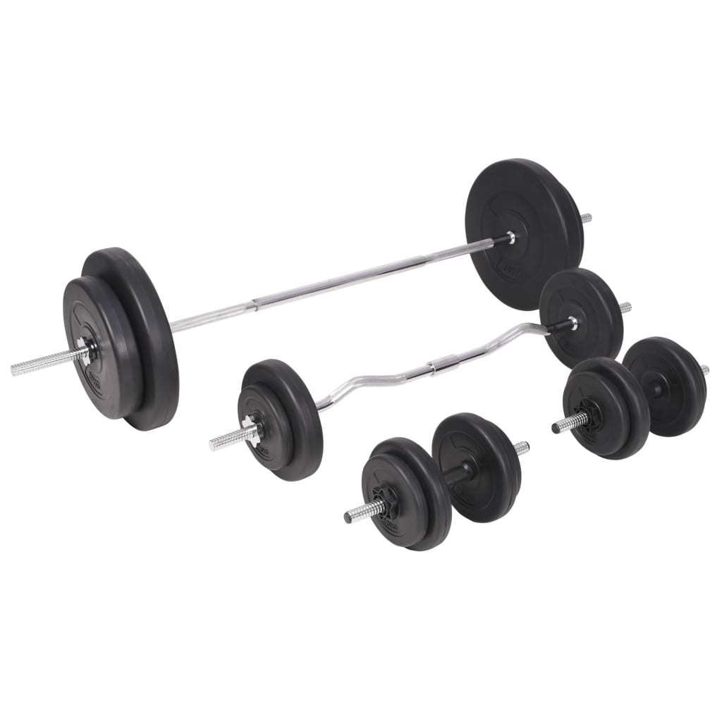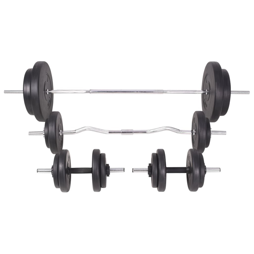 This set allows the users to variably select the weights they want to lift for different exercises. These plates are made of cement with a plastic shell and they can easily be secured onto the bars with the included star locks. The weight is clearly stamped on each plate for quick and easy identification.Workout bench:Material: SteelDimensions: 59.1" x 17.7" x 48.4" (L x W x H)Rack dimensions: 28.7" x 59.1" x 41.3" (L x W x H)Backrest dimensions: 28" x 9.4" x 1.6" (L x W x T)Seat dimensions: 15" x (9.4"-12.2") x 1.6" (L x W x T)Arm curl cushion dimensions: 17.3" x 11" x 1.6" (L x W x T)Maximum user weight: 220.5 lbBackrest height adjustable in 7 settings: Minimum 7.5", maximum 48.4"Seat height adjustable in 4 settings: Minimum 20.5", maximum 25.6"Bar support adjustable in 5 levels: Minimum 30.7", maximum 54.3"Arm curl cushion height adjustable in 7 settings: Minimum 31.5", maximum 38.6"Barbell and dumbbell set:Color: BlackMaterial: Cement plates + steel barsDiameter of plates (33.1 lb): 15.7"Diameter of plates (22 lb): 12.4"Diameter of plates (11 lb): 9.8"Diameter of plates (5.5 lb): 8.5"Diameter of plates (2.8 lb): 7.1"Hole diameter: 1"Barbell bar (straight) dimensions: 1" x 65" (Diameter x L)Barbell bar (curl) dimensions: 1" x 47.2" (Diameter x L)Dumbbell bar dimensions: 1" x 17.7" (Diameter x L)Total weight: 198.4 lbBarbell bar (straight) weight: 14.1 lbBarbell bar (curl) weight: 11.5 lbDumbbell bar weight (each): 1.3 lbPlate weight: 2 x 33.1 lb + 2 x 22 lb + 2 x 11 lb + 4 x 5.5 lb + 6 x 2.8 lbDelivery includes:1 x Workout bench2 x Plate (33.1 lb)2 x Plate (22 lb)2 x Plate (11 lb)4 x Plate (5.5 lb)6 x Plate (2.8 lb)1 x Barbell bar (straight)1 x Barbell bar (curl)2 x Dumbbell bar4 x Metal star lock (for barbell)4 x Plastic star lock (for dumbbell)With accessories